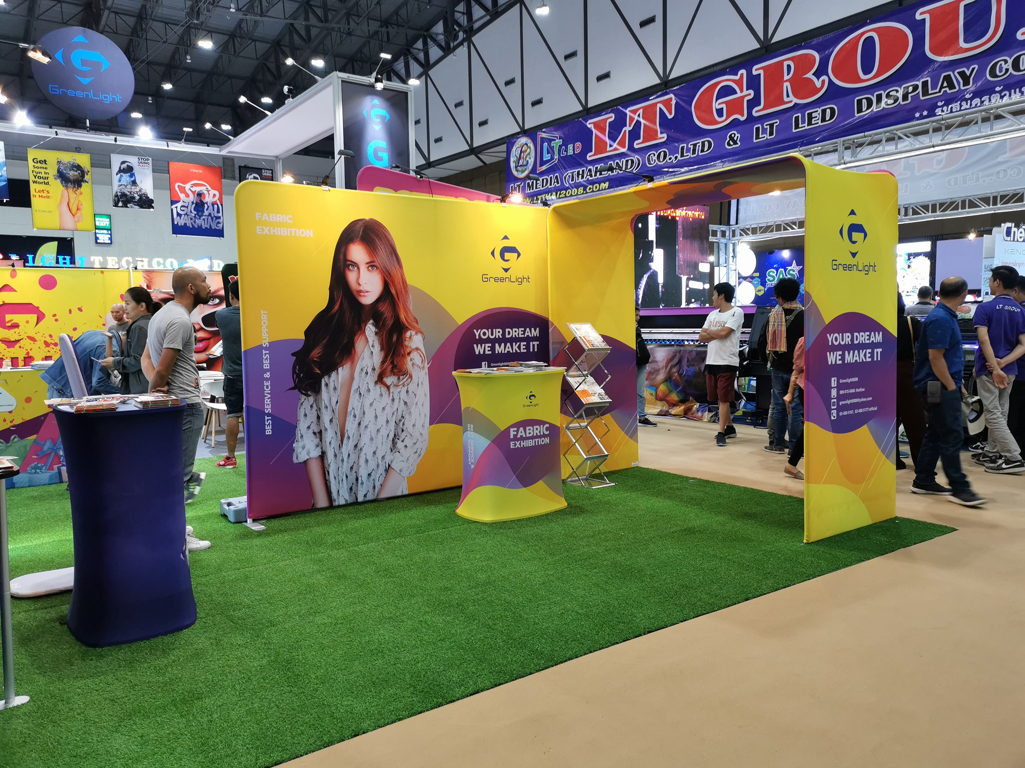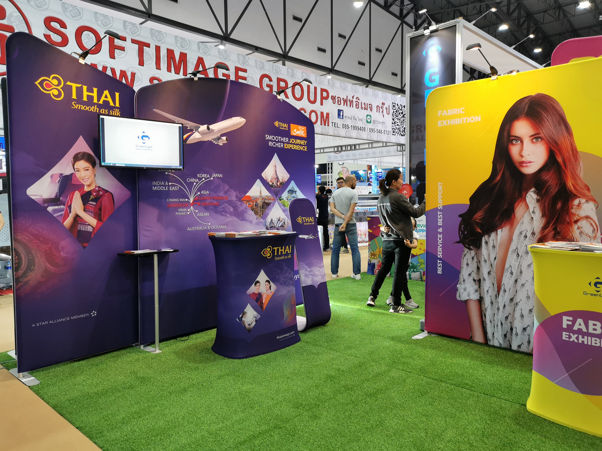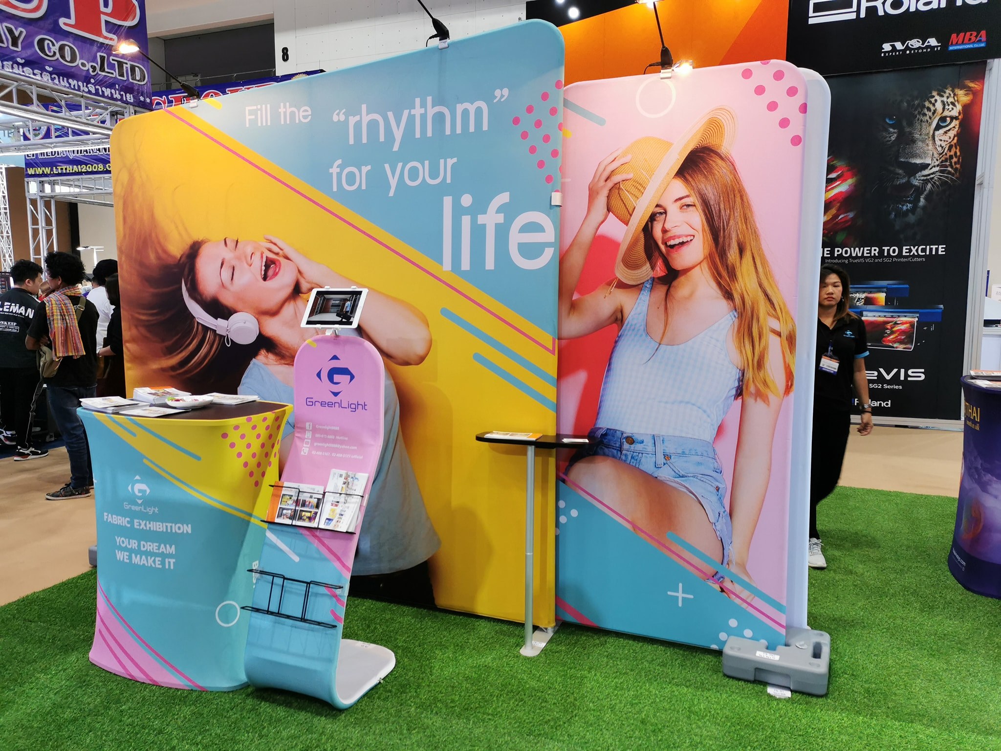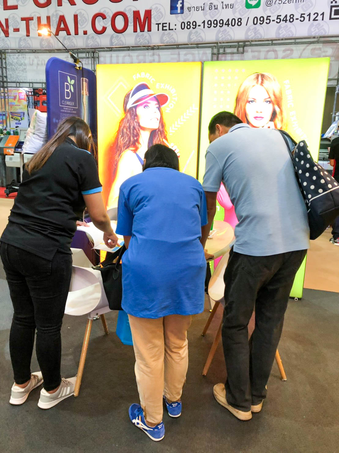 ในปีนี้ทางเราเองได้นำสินค้าในหมวด Fabric Exhibition อุปกรณ์ออกบูธงานพิมพ์ผ้าไม่ว่าจะเป็น Fabric Backdrop, Fabric Counter, Fabric Screen หลายหลายรูปแบบนำมาจัดแสดง ในปีทางเราเน้นเป็นพิเศษไปให้ส่วนของ Fabric Booth ที่ถูกจัดมารวมเป็น Set เพื่อให้ลูกค้าได้เห็นถึงประโยชน์ที่หลากหลายไม่ว่าจะเป็นจุดเด่นในเรื่องจุดเด่นของงานผ้าที่สีสันสวยงาม โครงที่มีน้ำหนักเบา อุปกรณ์น้อยชิ้นใช้งานได้สะดวก ยังสามารถใช้งานร่วมกันได้ดี ให้รูปแบบการจัดวางที่แปลกใหม่เสริมสร้างความน่าสนใจได้มากทีเดียว แค่พูดคงยังไม่เห็นภาพมาดูกันเลยว่าเรามีอะไรบ้าง