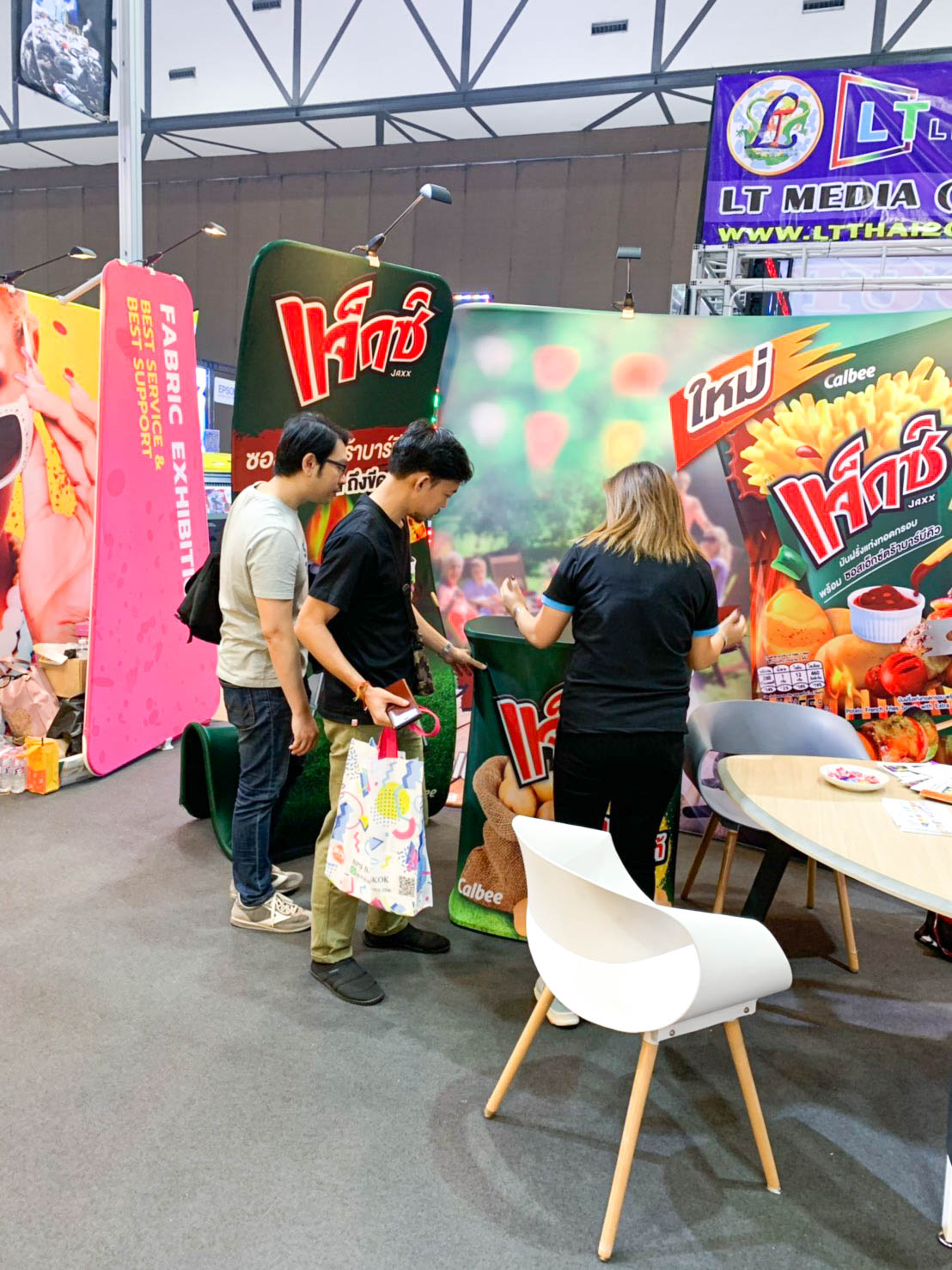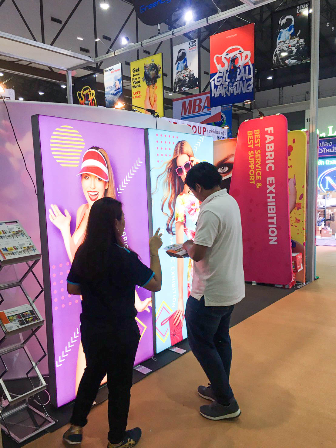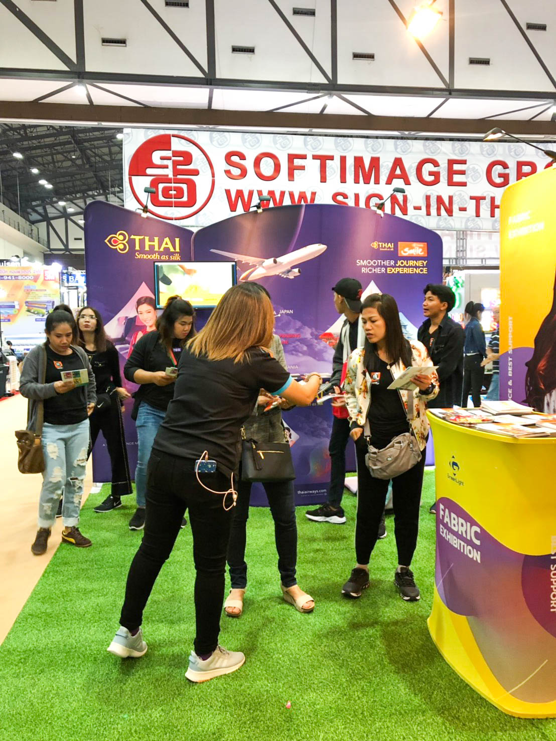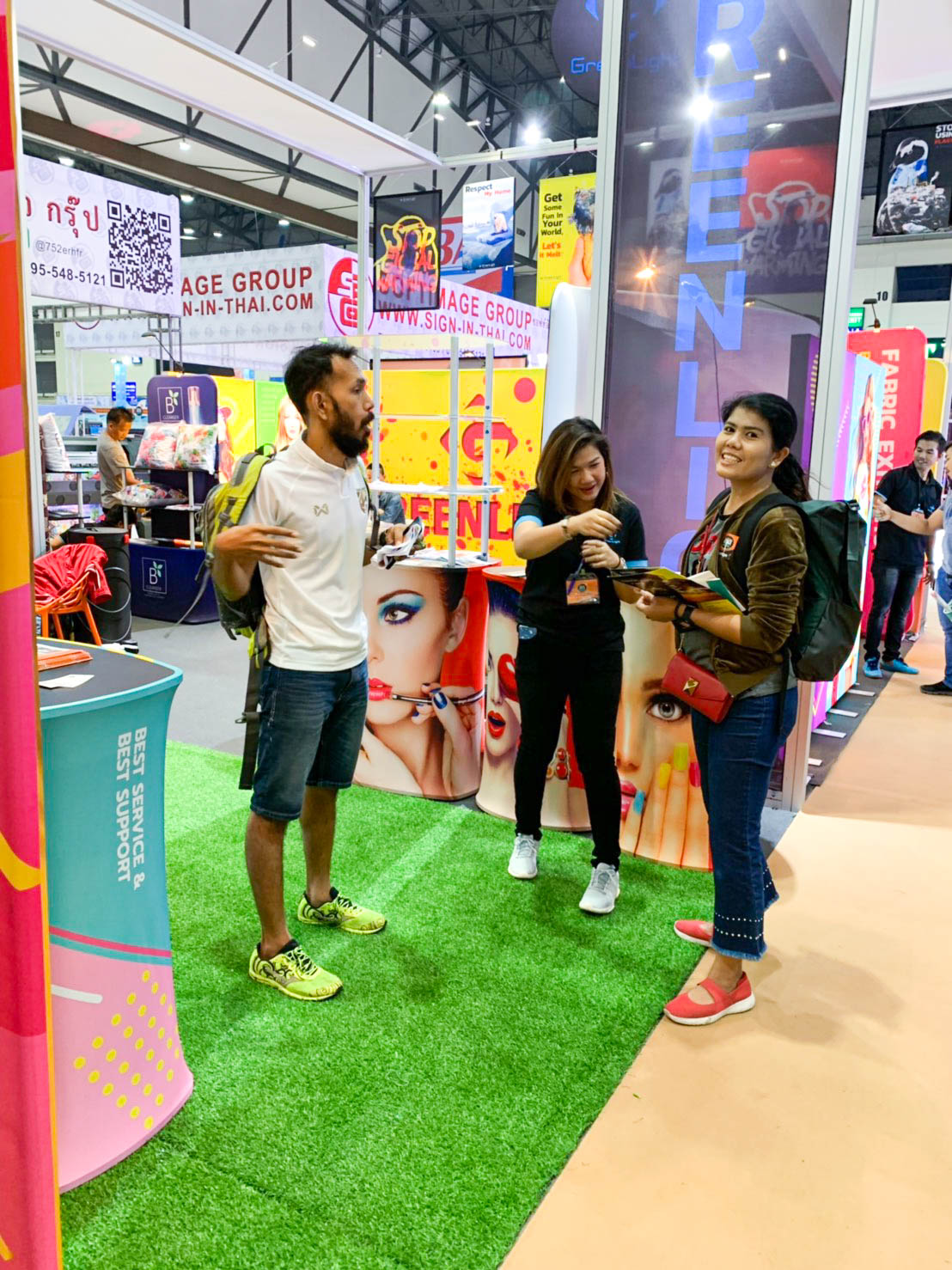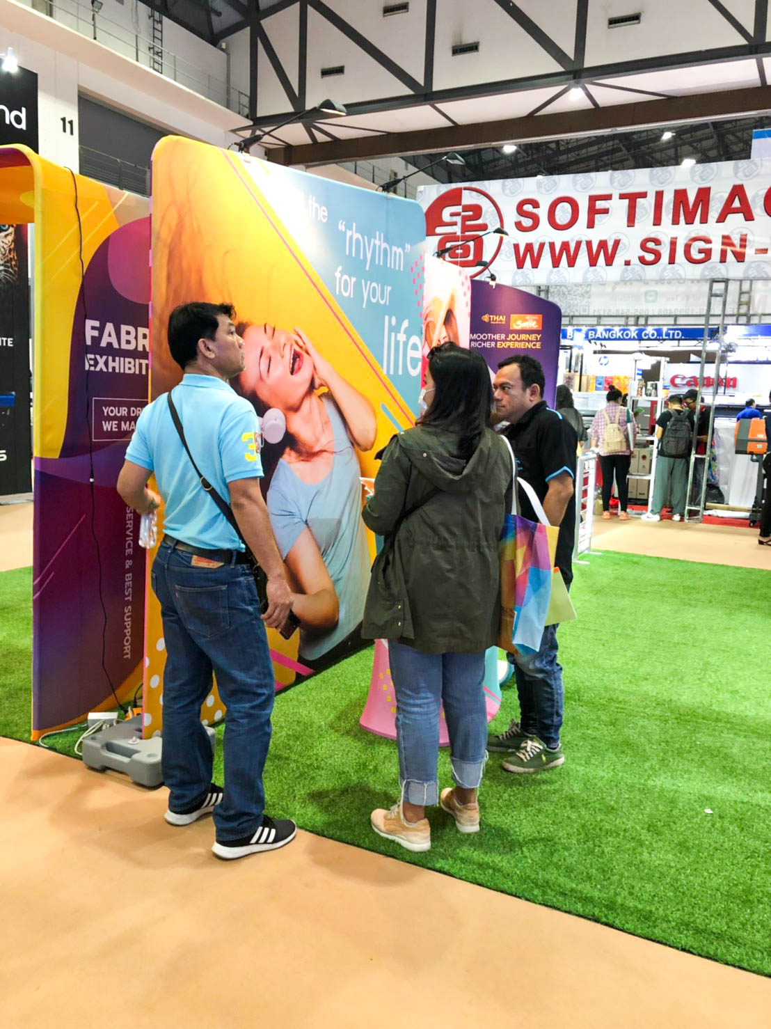 ในปีนี้ทางเราเองได้นำสินค้าในหมวด Fabric Exhibition อุปกรณ์ออกบูธงานพิมพ์ผ้าไม่ว่าจะเป็น Fabric Backdrop, Fabric Counter, Fabric Screen หลายหลายรูปแบบนำมาจัดแสดง ในปีทางเราเน้นเป็นพิเศษไปให้ส่วนของ Fabric Booth ที่ถูกจัดมารวมเป็น Set เพื่อให้ลูกค้าได้เห็นถึงประโยชน์ที่หลากหลายไม่ว่าจะเป็นจุดเด่นในเรื่องจุดเด่นของงานผ้าที่สีสันสวยงาม โครงที่มีน้ำหนักเบา อุปกรณ์น้อยชิ้นใช้งานได้สะดวก ยังสามารถใช้งานร่วมกันได้ดี ให้รูปแบบการจัดวางที่แปลกใหม่เสริมสร้างความน่าสนใจได้มากทีเดียว แค่พูดคงยังไม่เห็นภาพมาดูกันเลยว่าเรามีอะไรบ้าง