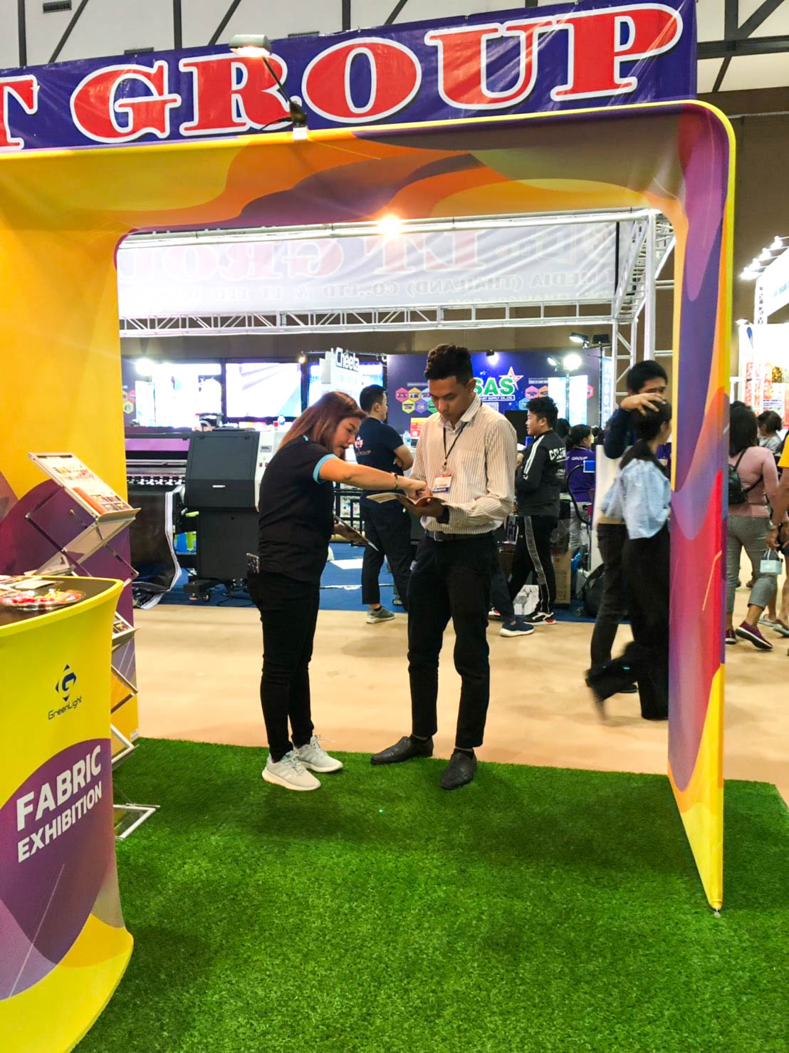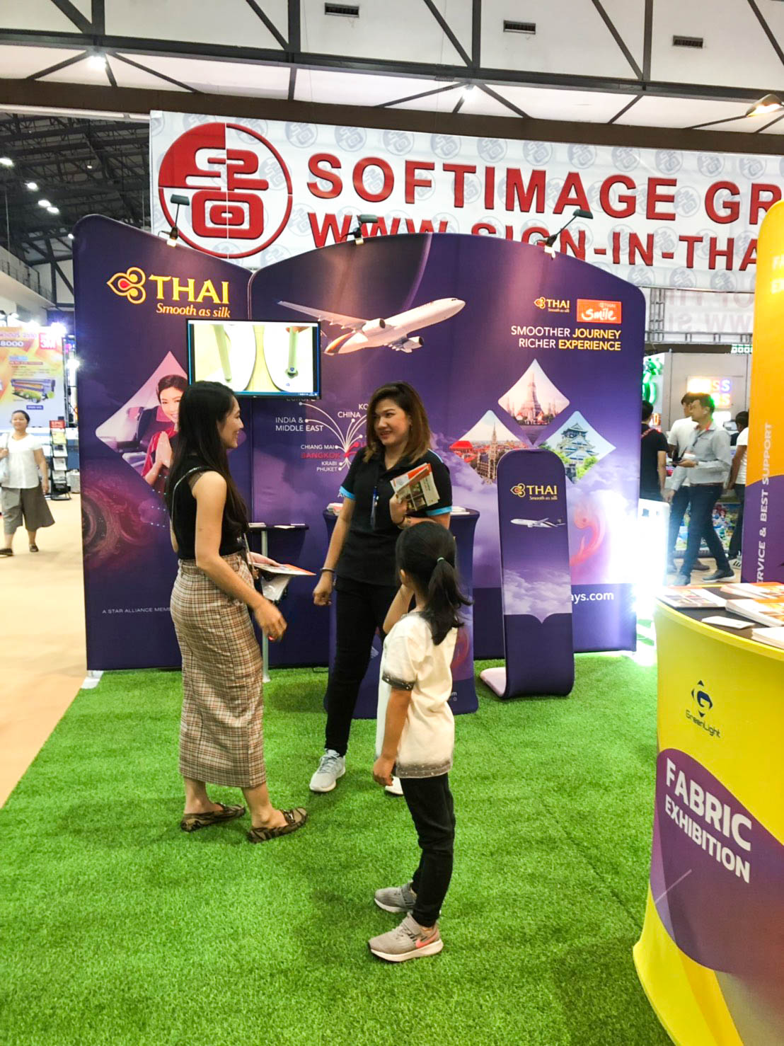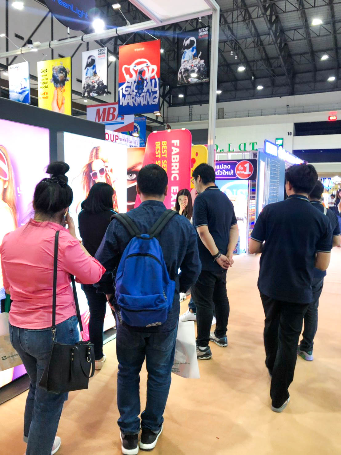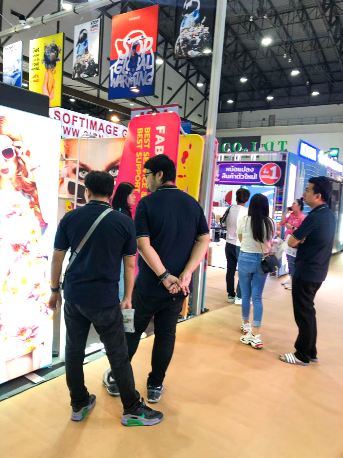 ในปีนี้ทางเราเองได้นำสินค้าในหมวด Fabric Exhibition อุปกรณ์ออกบูธงานพิมพ์ผ้าไม่ว่าจะเป็น Fabric Backdrop, Fabric Counter, Fabric Screen หลายหลายรูปแบบนำมาจัดแสดง ในปีทางเราเน้นเป็นพิเศษไปให้ส่วนของ Fabric Booth ที่ถูกจัดมารวมเป็น Set เพื่อให้ลูกค้าได้เห็นถึงประโยชน์ที่หลากหลายไม่ว่าจะเป็นจุดเด่นในเรื่องจุดเด่นของงานผ้าที่สีสันสวยงาม โครงที่มีน้ำหนักเบา อุปกรณ์น้อยชิ้นใช้งานได้สะดวก ยังสามารถใช้งานร่วมกันได้ดี ให้รูปแบบการจัดวางที่แปลกใหม่เสริมสร้างความน่าสนใจได้มากทีเดียว แค่พูดคงยังไม่เห็นภาพมาดูกันเลยว่าเรามีอะไรบ้าง