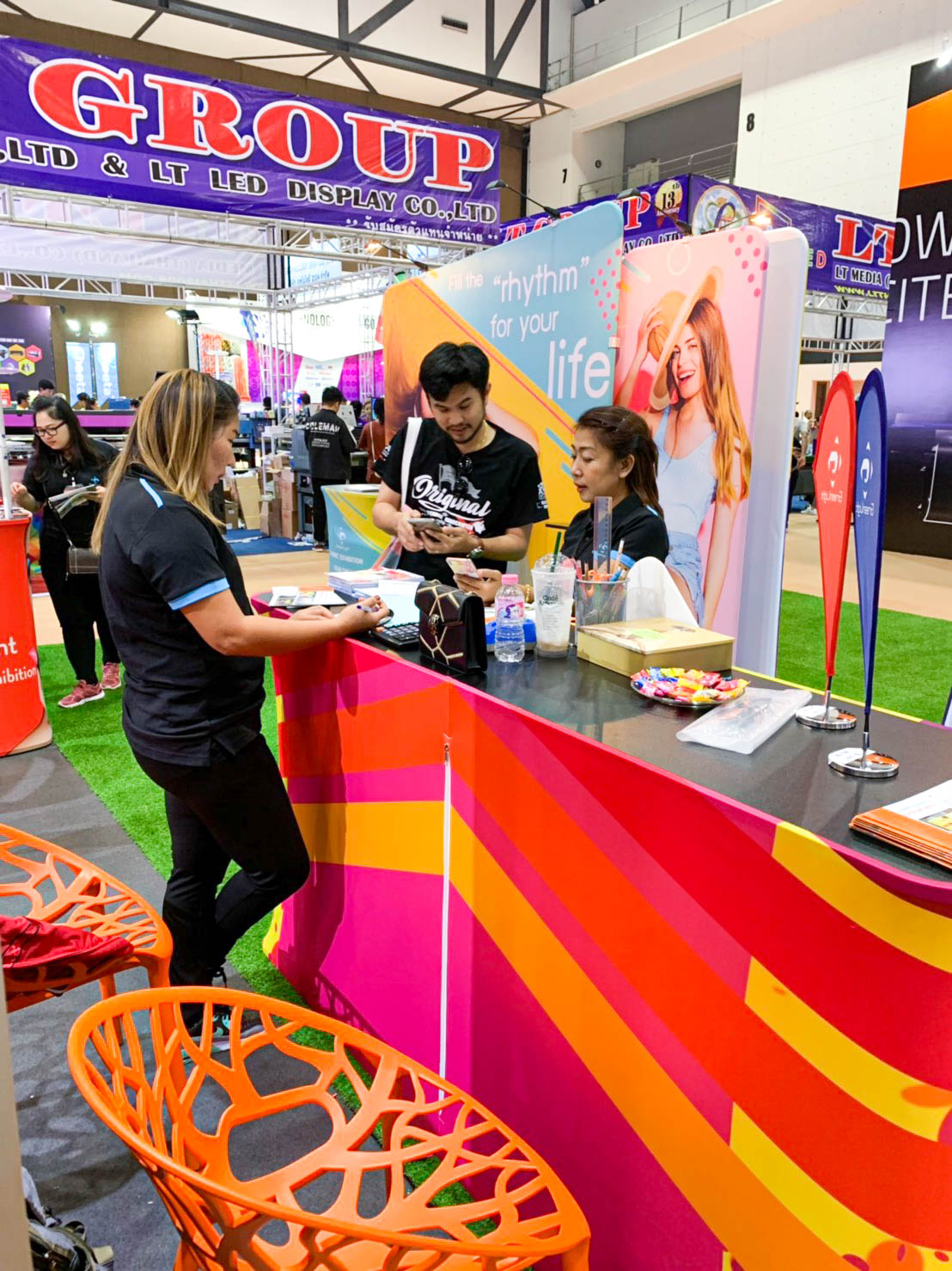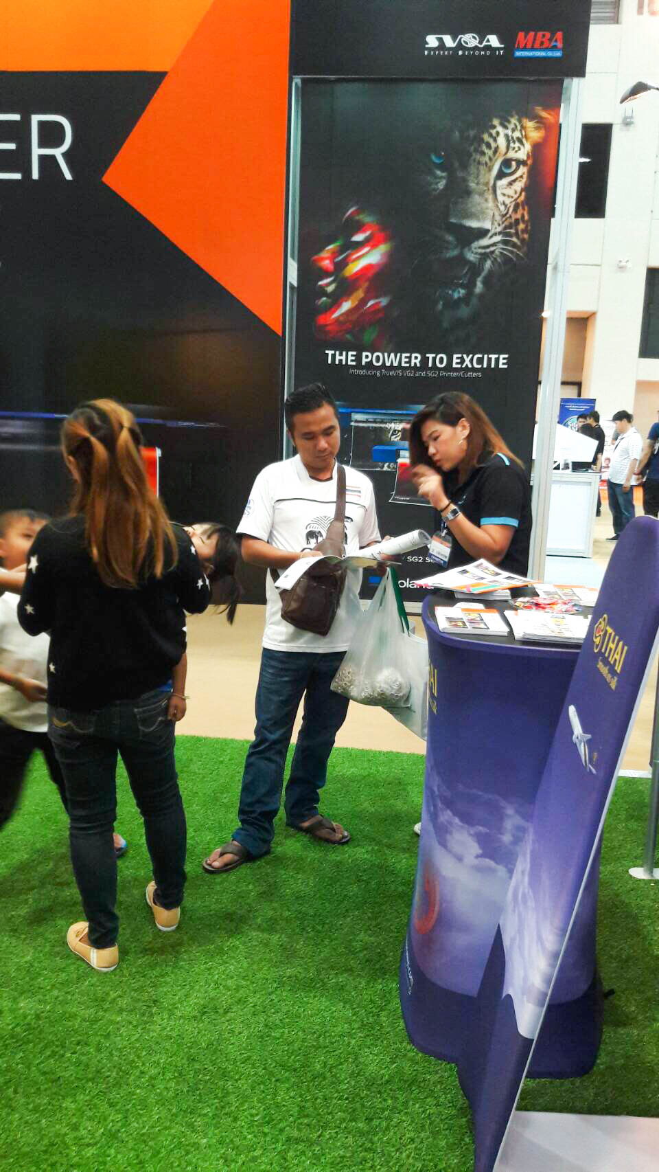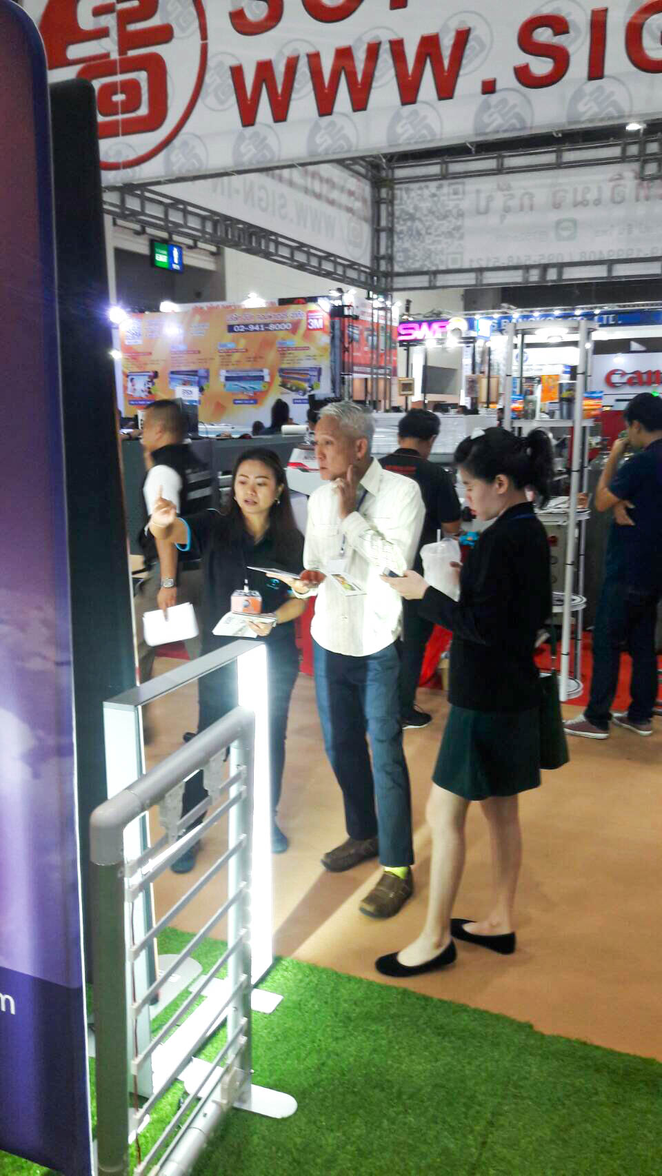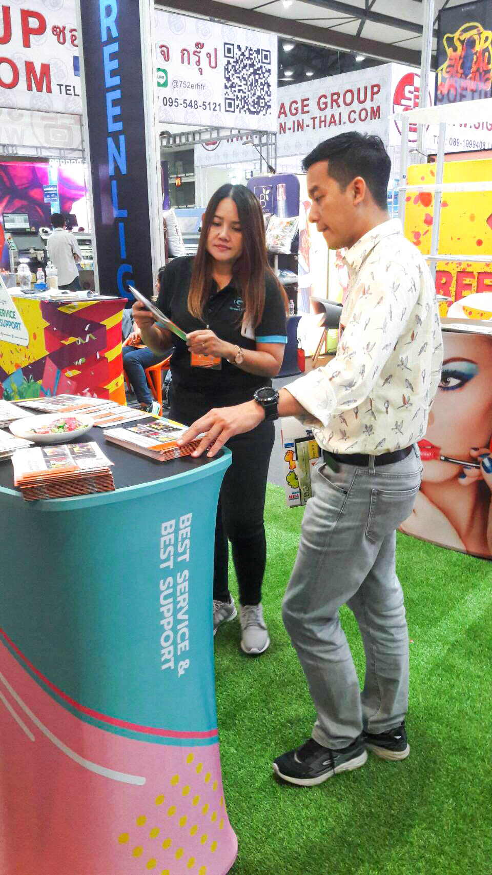ในปีนี้ทางเราเองได้นำสินค้าในหมวด Fabric Exhibition อุปกรณ์ออกบูธงานพิมพ์ผ้าไม่ว่าจะเป็น Fabric Backdrop, Fabric Counter, Fabric Screen หลายหลายรูปแบบนำมาจัดแสดง ในปีทางเราเน้นเป็นพิเศษไปให้ส่วนของ Fabric Booth ที่ถูกจัดมารวมเป็น Set เพื่อให้ลูกค้าได้เห็นถึงประโยชน์ที่หลากหลายไม่ว่าจะเป็นจุดเด่นในเรื่องจุดเด่นของงานผ้าที่สีสันสวยงาม โครงที่มีน้ำหนักเบา อุปกรณ์น้อยชิ้นใช้งานได้สะดวก ยังสามารถใช้งานร่วมกันได้ดี ให้รูปแบบการจัดวางที่แปลกใหม่เสริมสร้างความน่าสนใจได้มากทีเดียว แค่พูดคงยังไม่เห็นภาพมาดูกันเลยว่าเรามีอะไรบ้าง