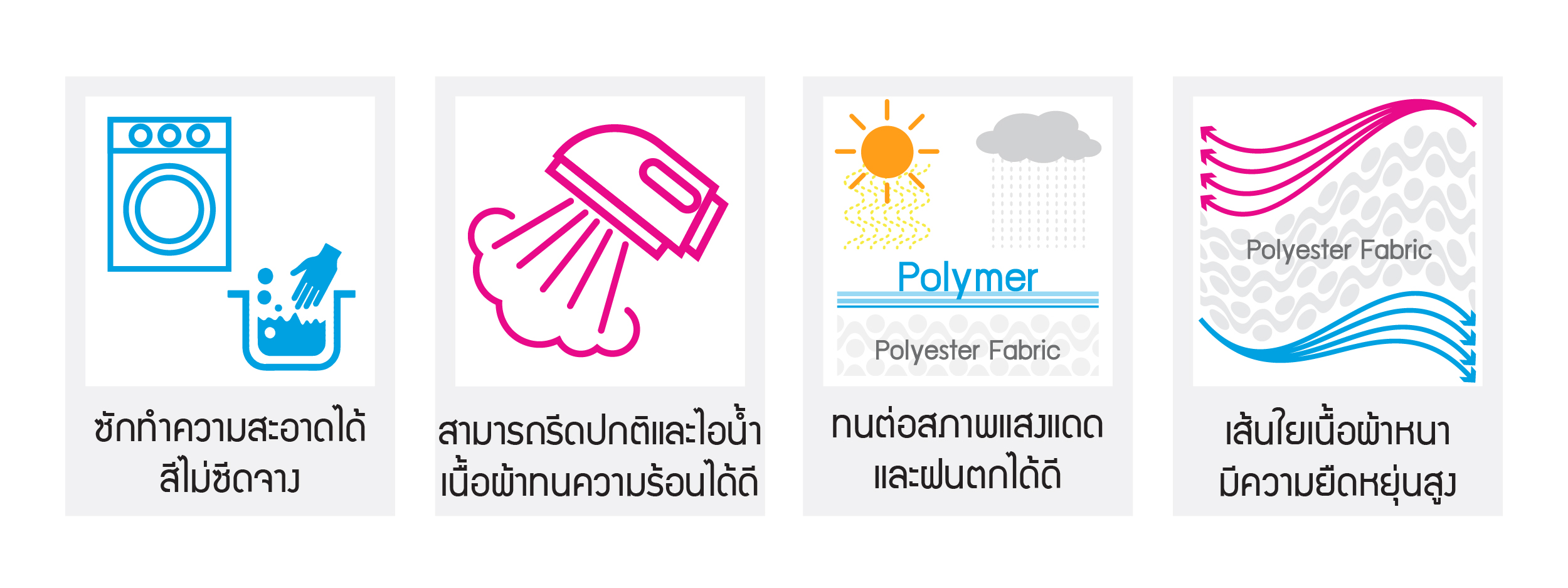 นำกับมาใช้ได้หลายครั้งเนื้อผ้าที่ใช้พิมพ์เคลือบผิวด้วย Polymer ไม่ทำให้ผ้าเป็น ขุย, เป็นเส้นขน, ทนต่อแสงแดดและฝน
