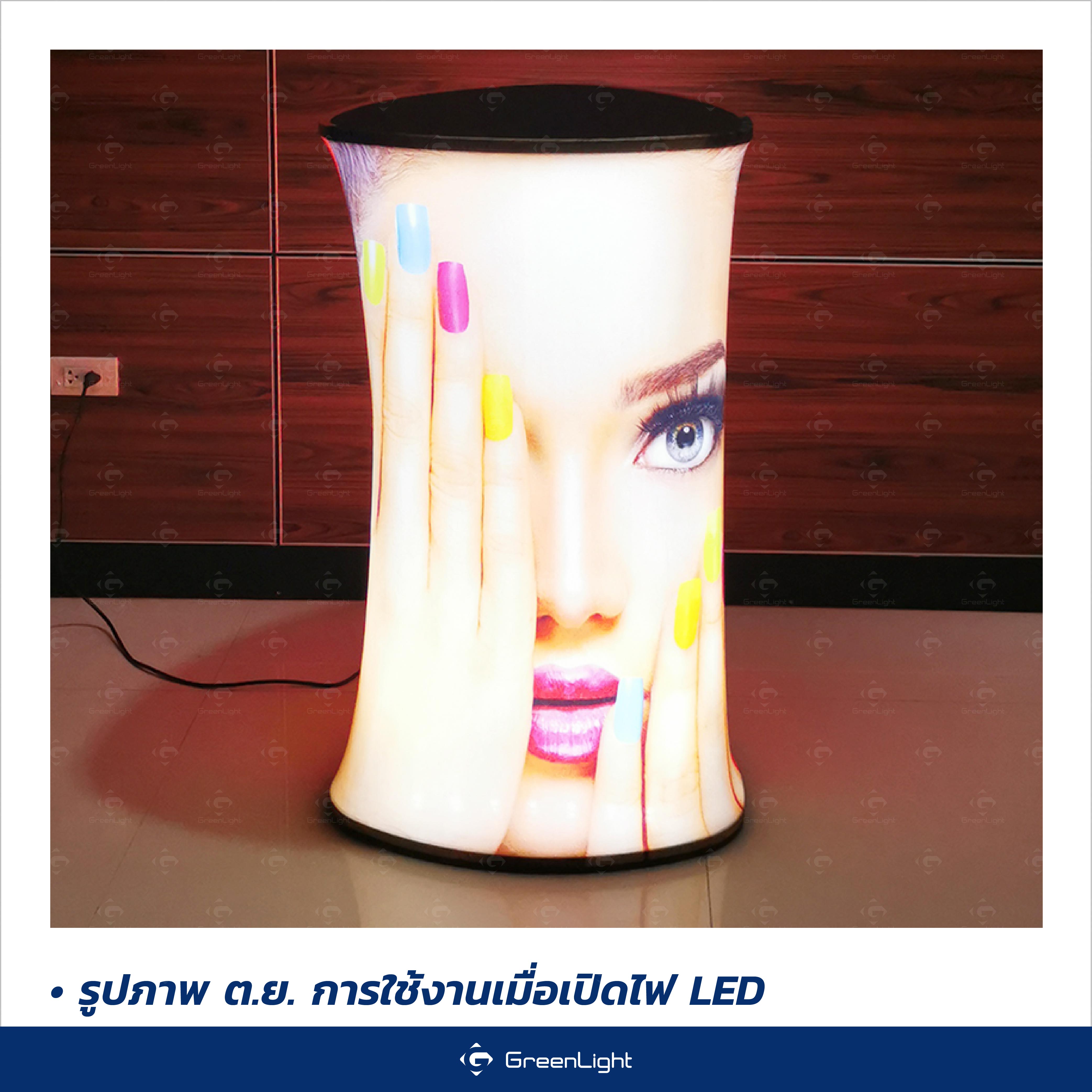เคาน์เตอร์ผ้า ทรงสามเหลี่ยมพร้อมชุดไฟ LED Fabric Counter FB-5C1 เทคนิคการพิมพ์ที่ทางกรีนไลท์ เลือกใช้ ผลิตสินค้าเป็น ระบบ Dye Sublimation ให้งานพิมพ์ สีสวยคมชัด ใน 2 ขั้นตอน
