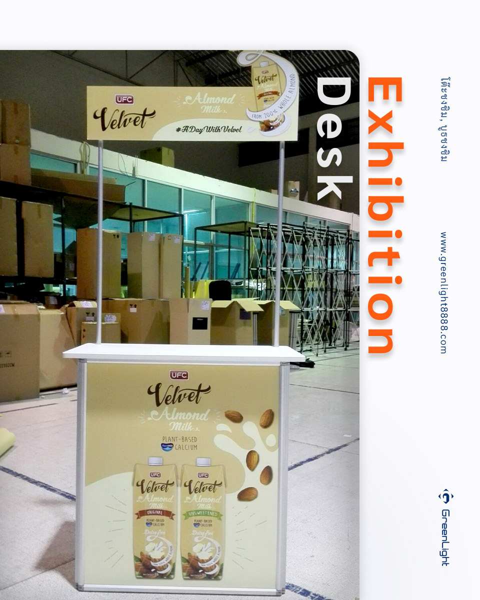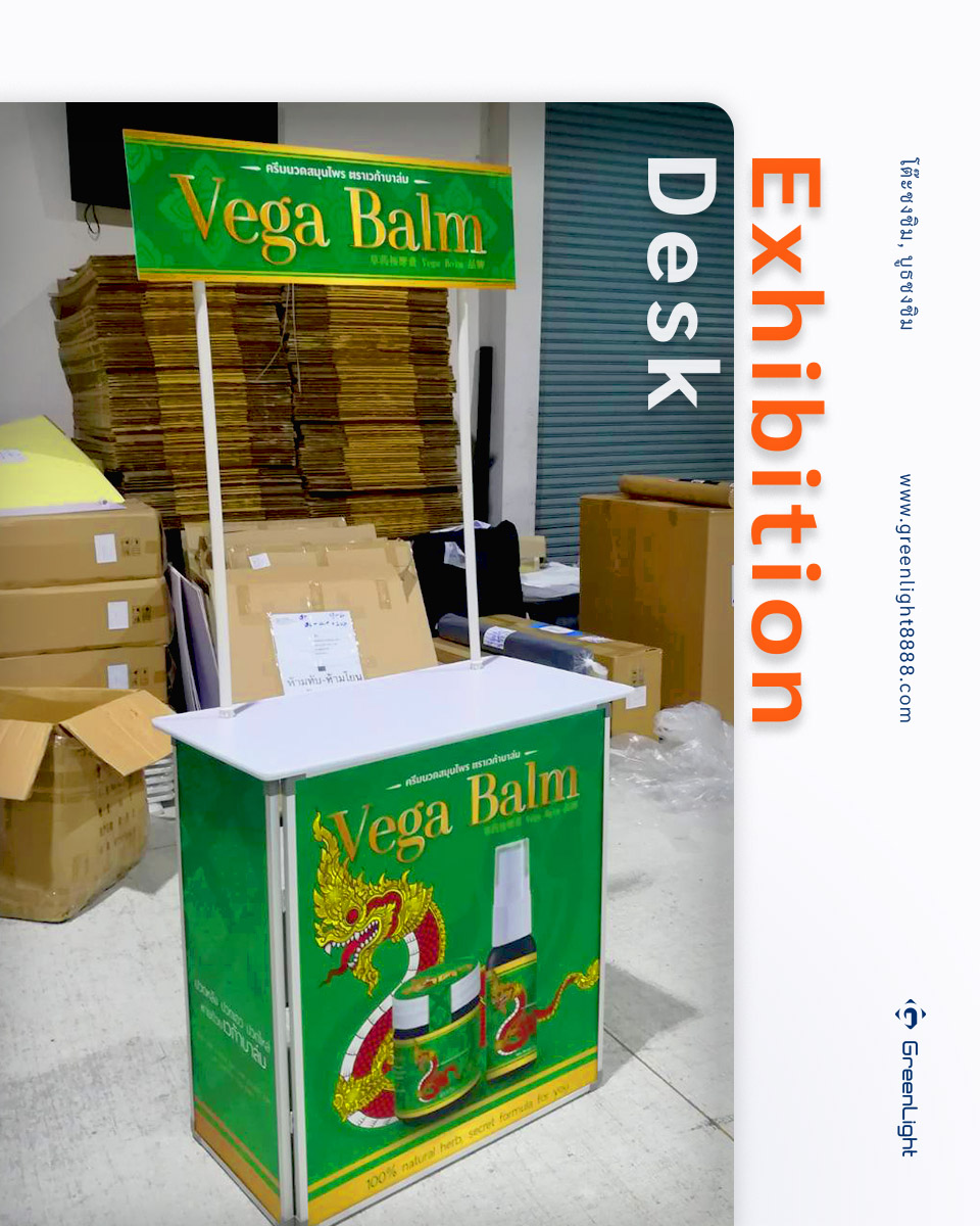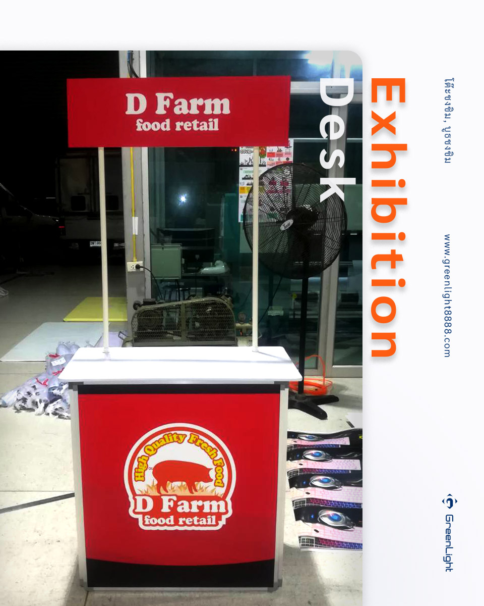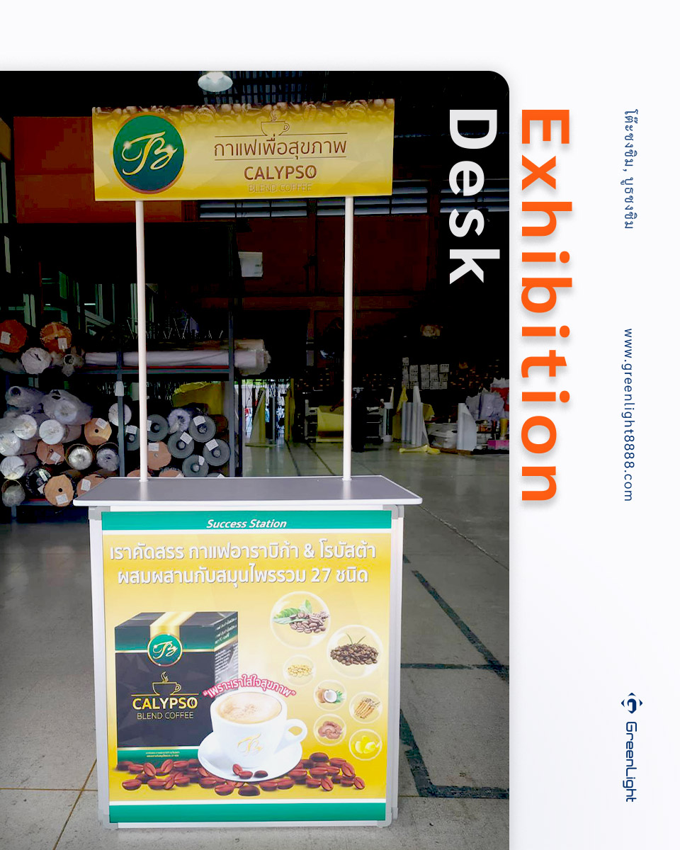 โต๊ะออกบูธ, โต๊ะโปรโมชั่น Exhibition Desk งานพิม์ Sticker PP Indoor นิยมใช้ในการทำการตลาดสินค้าต่างๆ ทั้งใน ห้างสรรพสินค้า, ร้านสะดวกซื้อและ Supermarket ร้านขายยา, สถานีรถไฟฟ้า, งานอีเว้นท์งานแสดงสินค้า สถานที่ต่างๆตามกลุ่มเป้าหมายของสินค้านั้นๆ ไม่ว่าจะเป็นสาธิตการประกอบอาหารเชิญชวน, เชิญชิม, แจกสินค้าทดลองใช้