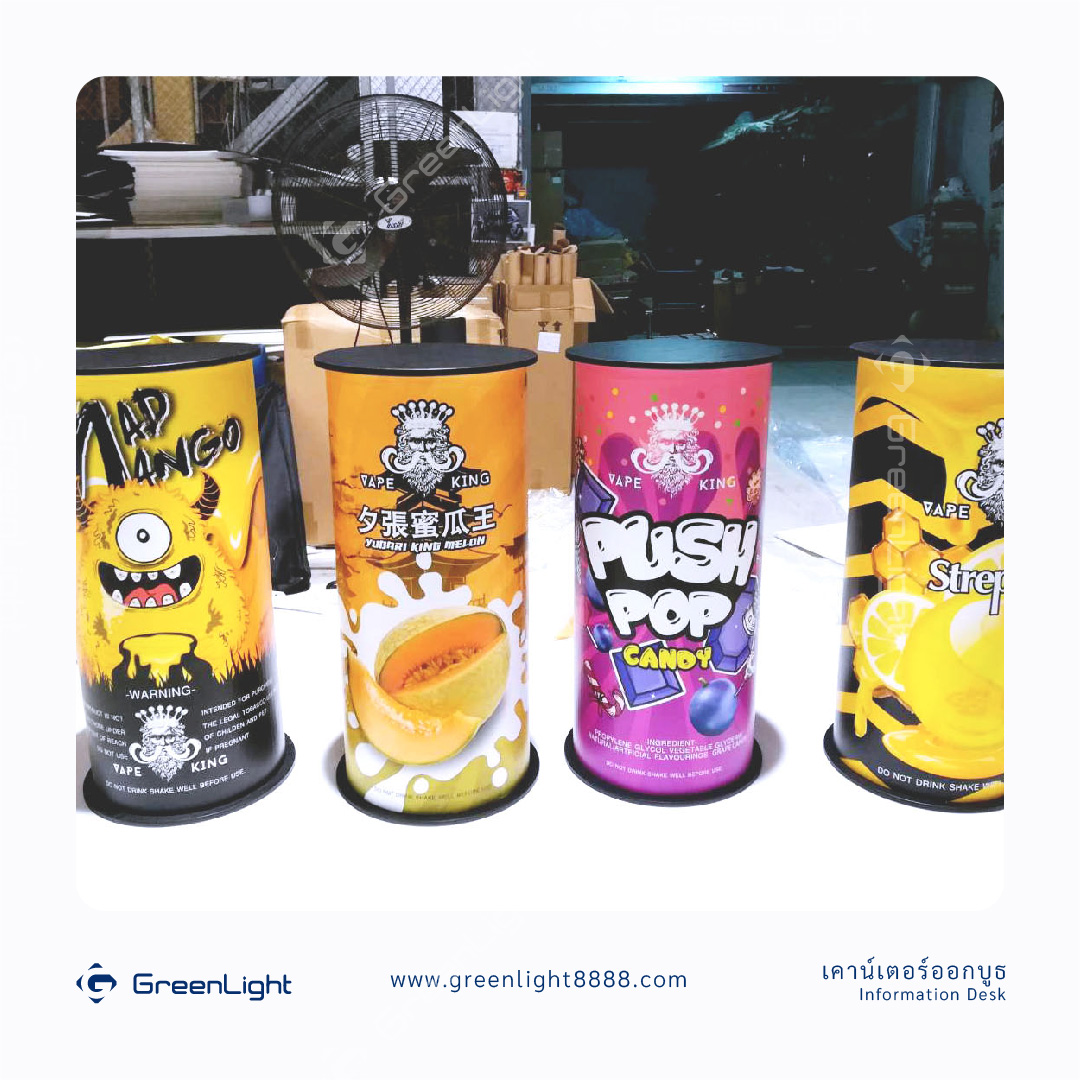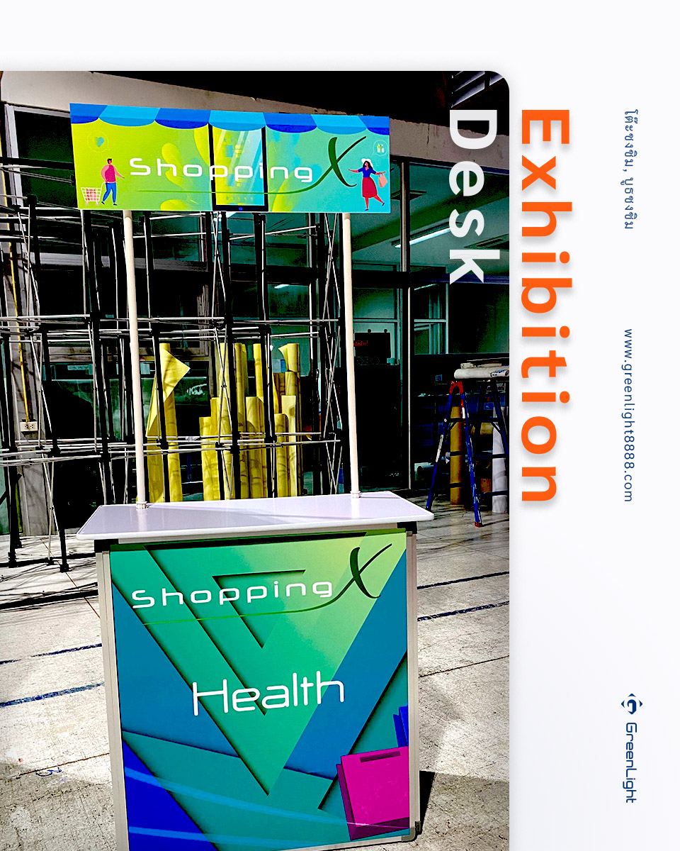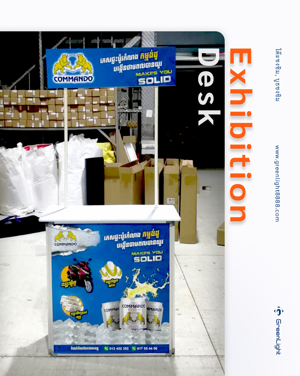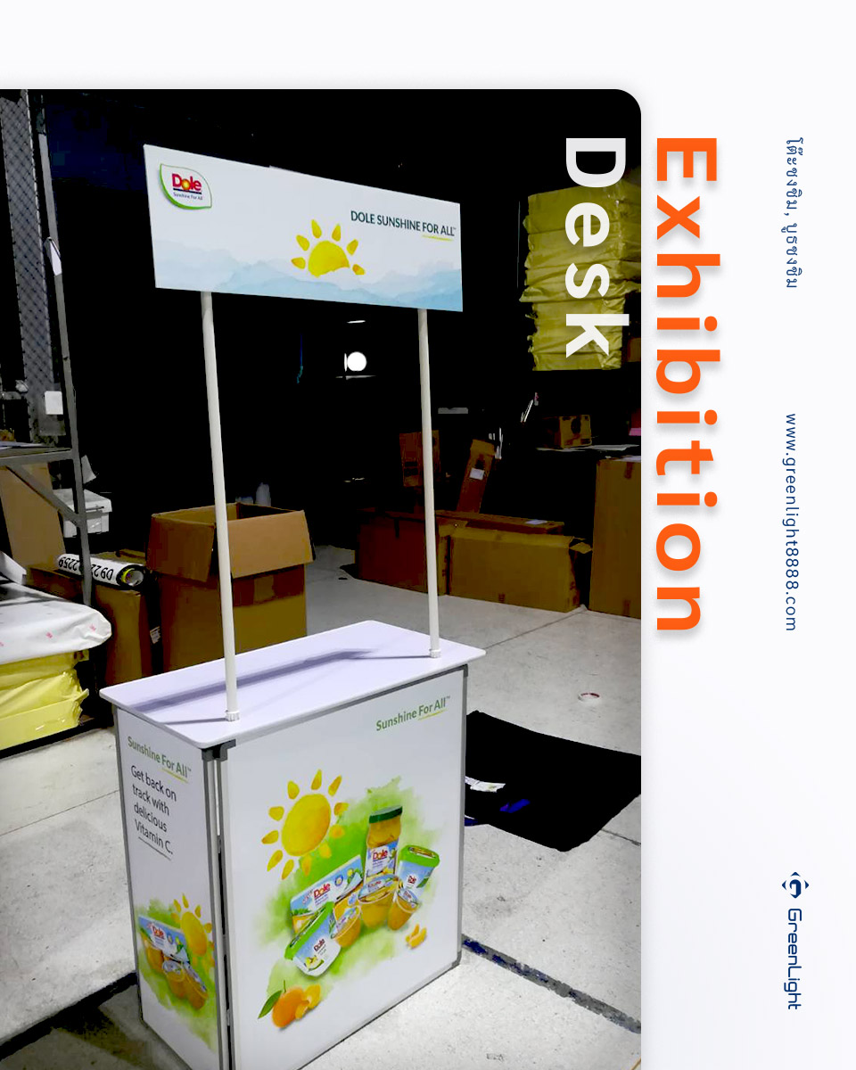 โต๊ะออกบูธ, โต๊ะโปรโมชั่น Exhibition Desk งานพิม์ Sticker PP Indoor นิยมใช้ในการทำการตลาดสินค้าต่างๆ ทั้งใน ห้างสรรพสินค้า, ร้านสะดวกซื้อและ Supermarket ร้านขายยา, สถานีรถไฟฟ้า, งานอีเว้นท์งานแสดงสินค้า สถานที่ต่างๆตามกลุ่มเป้าหมายของสินค้านั้นๆ ไม่ว่าจะเป็นสาธิตการประกอบอาหารเชิญชวน, เชิญชิม, แจกสินค้าทดลองใช้
